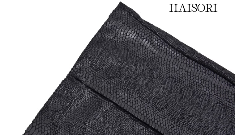Pants with a cool design that incorporates a skin-like pattern in the fabric and metal parts as accents.