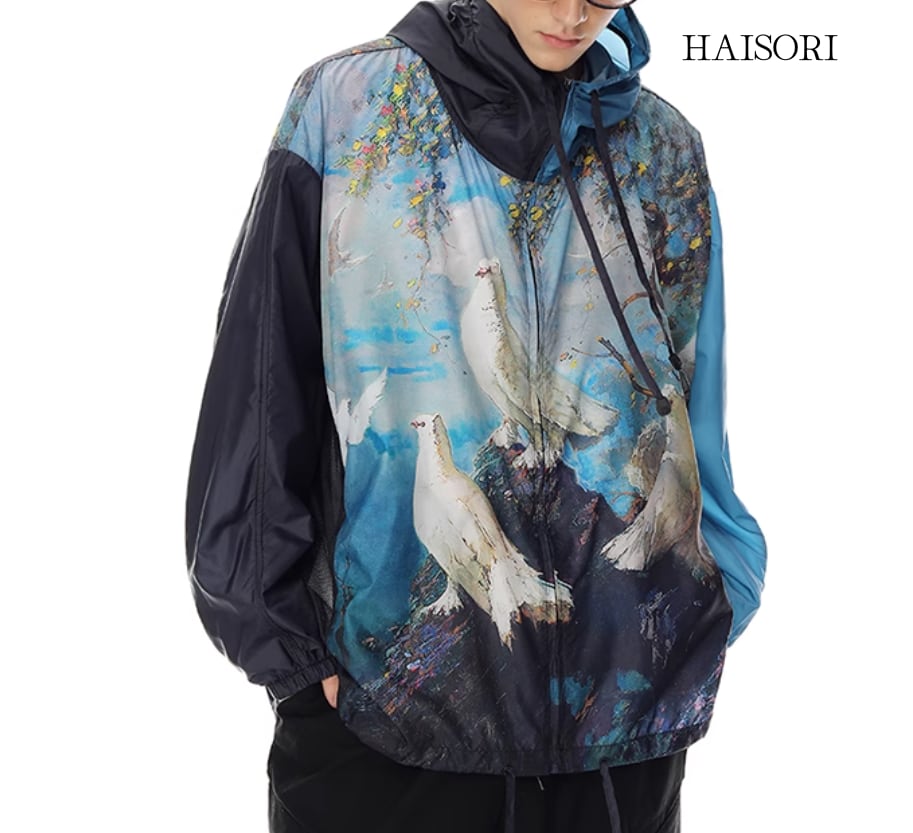 The design of the outerwear is colorful and has a painting-like design.