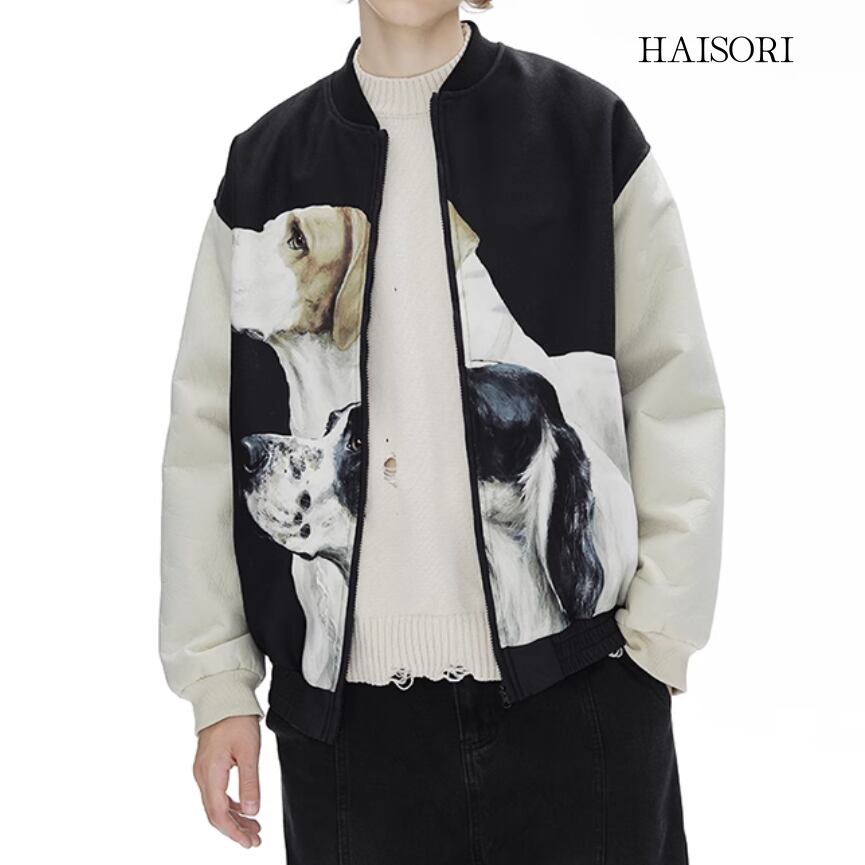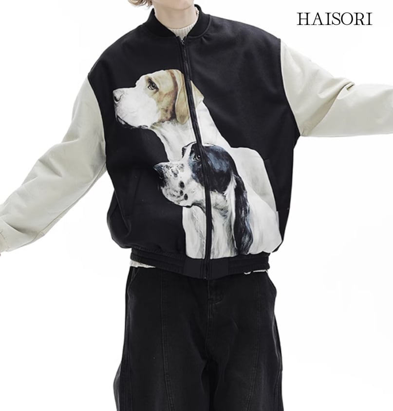 ★【 モノトーンカラーに犬のイラストをプリント、カジュアルスタイルのアウター 】