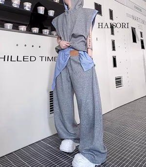 ★【 柄入り生地をアクセントにしたデザイン、ルーズシルエットのフード付きカジュアルセットアップ 】