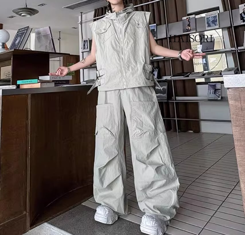 トップスは複数の立体的なポケットデザインがアクセント。パンツはワイドレッグで、リラックス感のある着心地とモダンなスタイルを両立します。