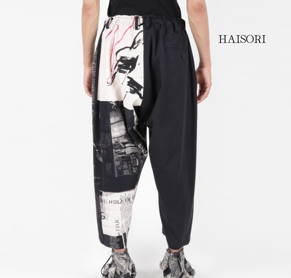 片側には赤のラインアートと顔のグラフィック、もう片側には新聞のコラージュプリントが施され、個性的な表情を演出します。
