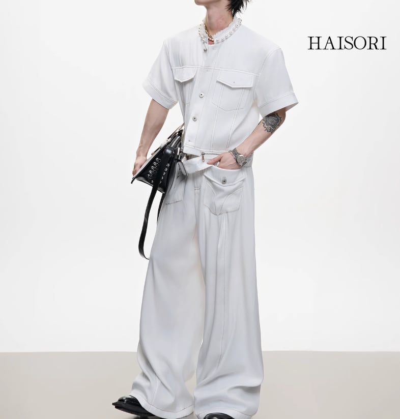 ★【 抽象的なビーズが襟にに施された半袖シャツとパンツのセットアップです。