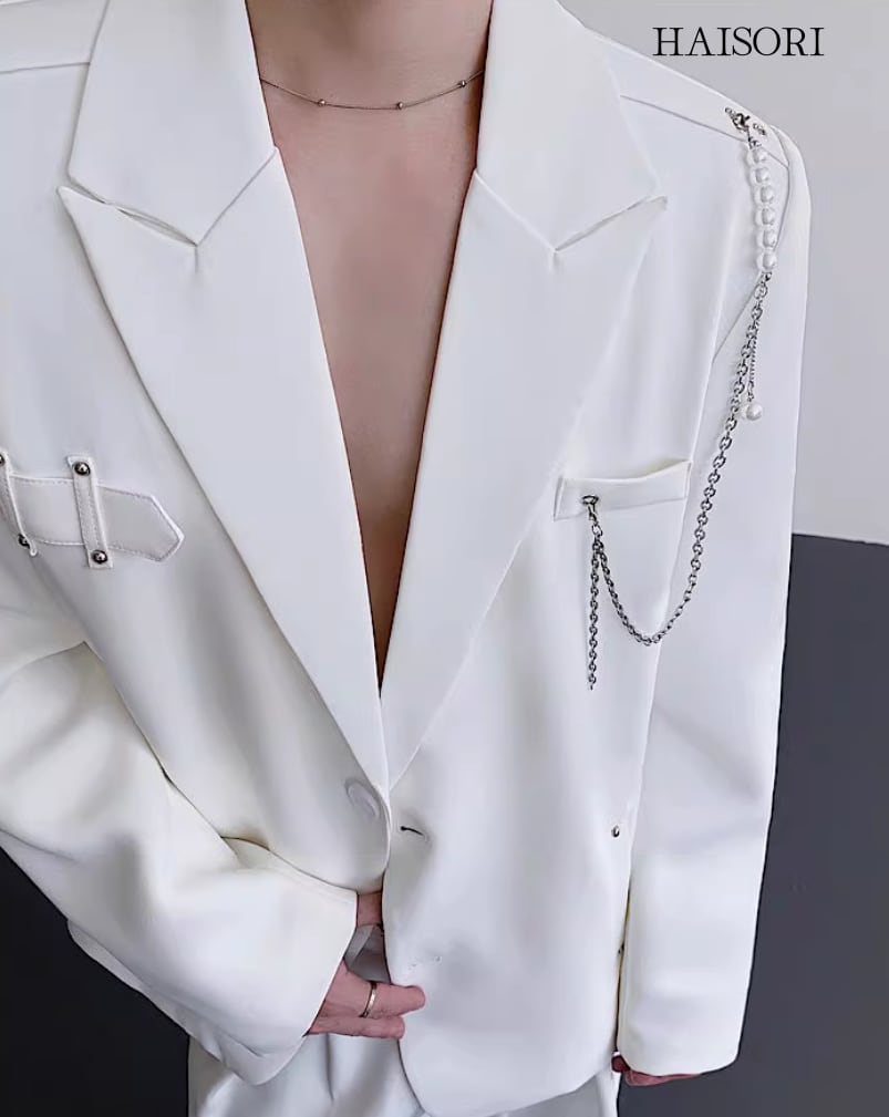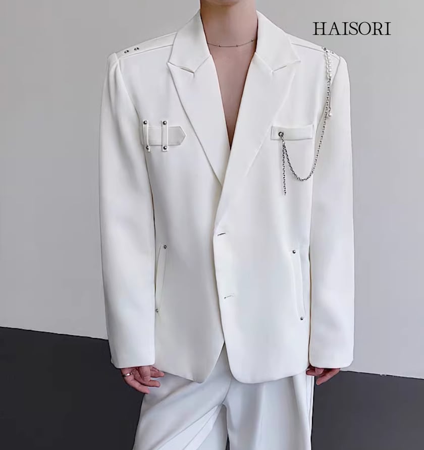 ★【 ショルダー部分やポケットにあしらわれたバックルやチェーンが、クールな印象のジャケットです。
