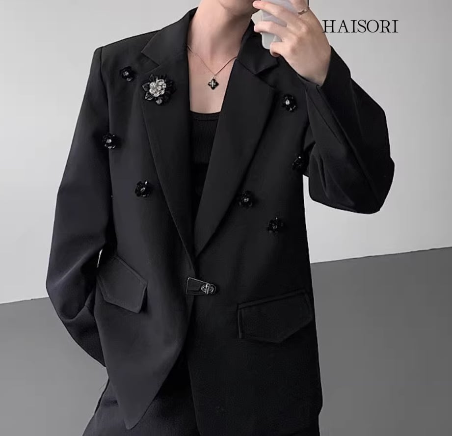 ★【 全体に施された花のモチーフが目を引く、ダブルブレストのジャケットです。 ゆったりとしたオーバーサイズのシルエットが、モード感のある着こなしを演出します。 パーティーやイベント、個性的なファッションがお好きな方におすすめです。 】