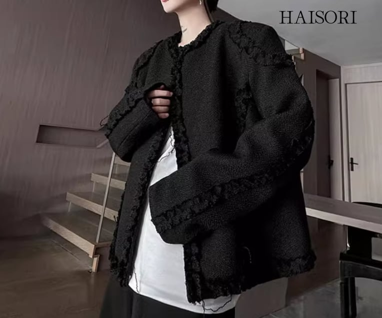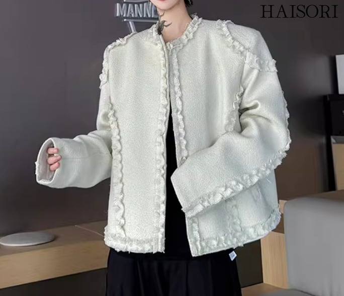 ★【 襟元やポケット部分にフリルのような装飾が施された、個性的なデザインのジャケットです。