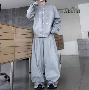 ★【 フロントの複数のボタンとルーズなシルエットが特徴的な、ジャケットとワイドパンツのセットアップです。