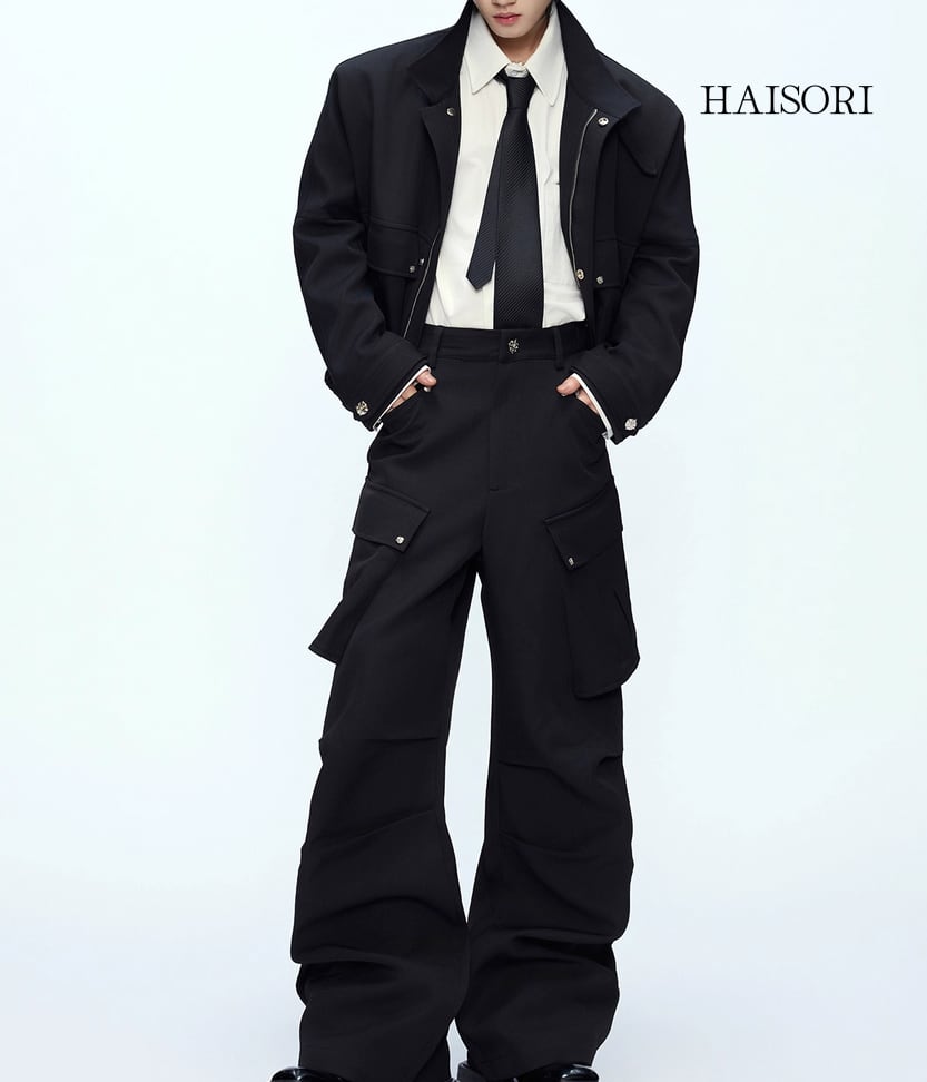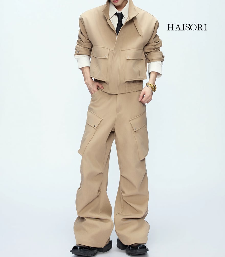 クロップ丈のジャケットとワイドなカーゴパンツが、フォーマルとストリートの境界を越えるスタイルを演出します。