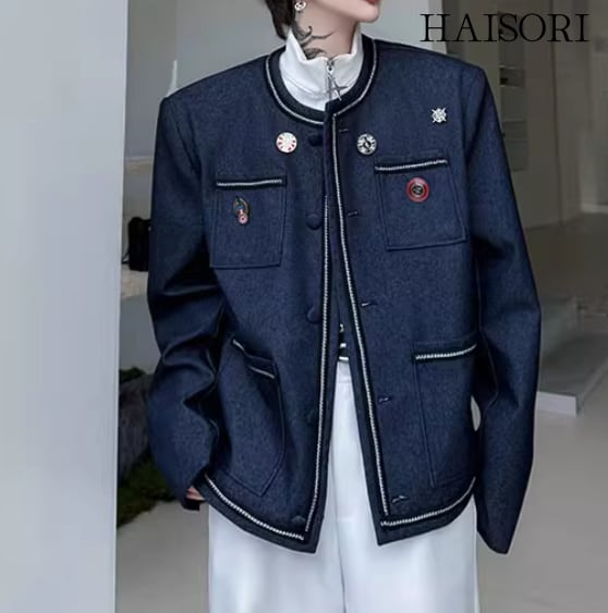 ★【 ノーカラーのジャケットに、黒の縁取りと装飾パーツがアクセントとして映えるデザイン。