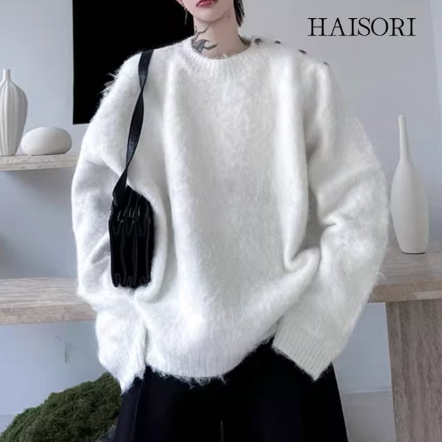 ★【 起毛感のある柔らかな生地に、肩のボタンがアクセントとして映えるトップス。