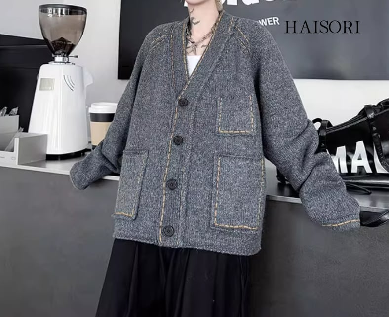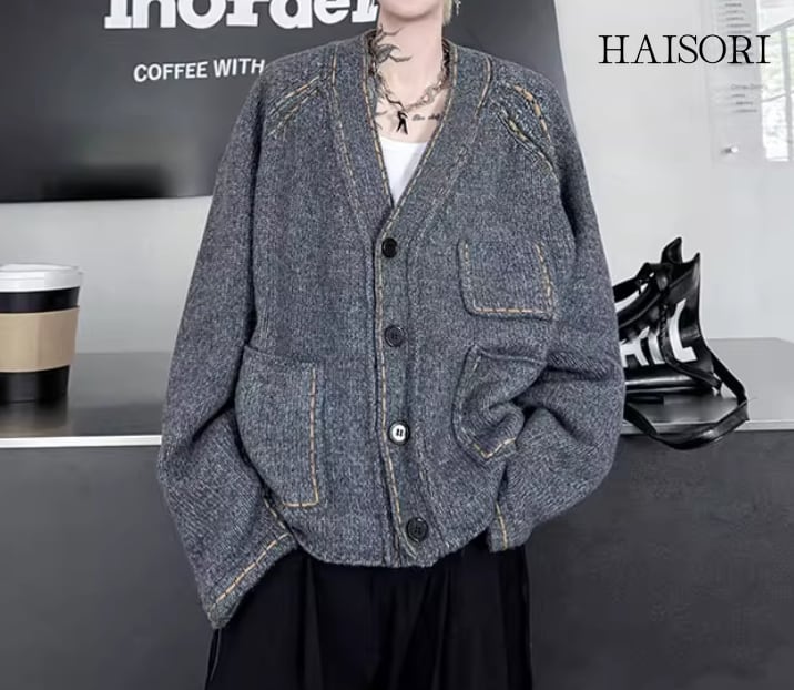 ★【 デニムのような風合いと、縁取りのステッチが特徴的なVネックのニットカーディガンです。