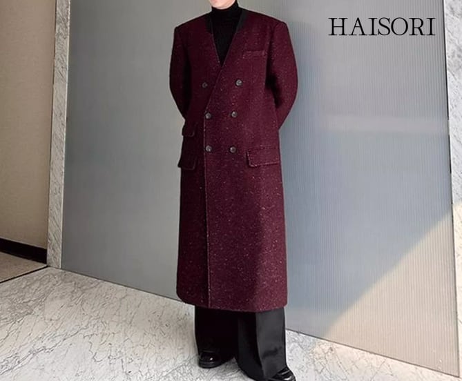 (NEW) Collarless V-Neck Double-Breasted Long Coat