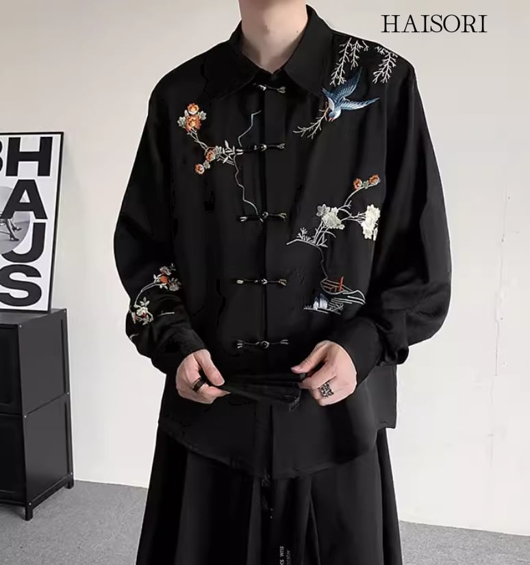 ★【 伝統的なチャイナボタンのデザインに、鮮やかな花鳥の刺繍をあしらったモダンなオリエンタルシャツです。