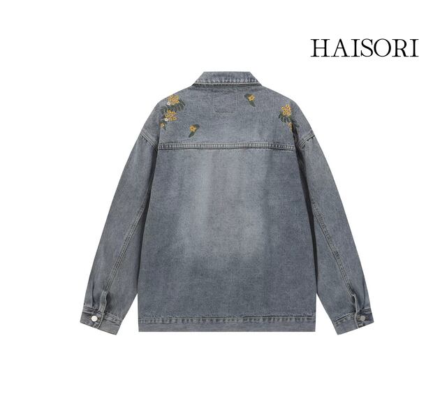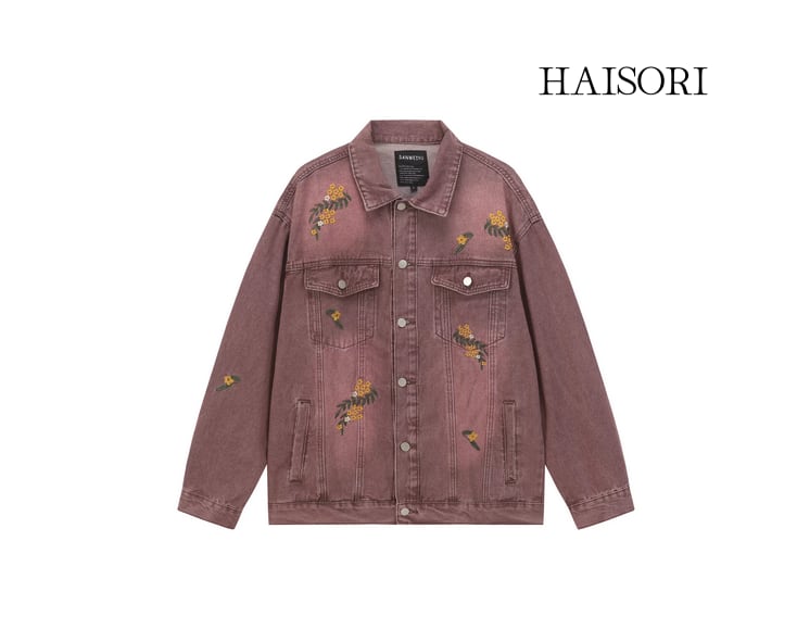ヴィンテージ感のあるデニムの風合いと、繊細なステッチで描かれたボタニカルデザインのコントラストが、洗練された都会的なカジュアルスタイルを演出します。