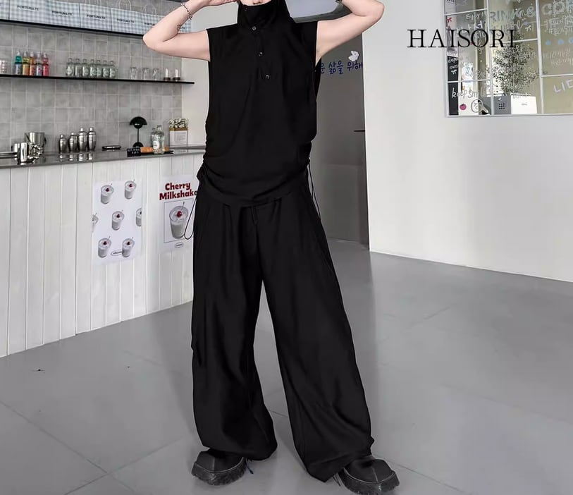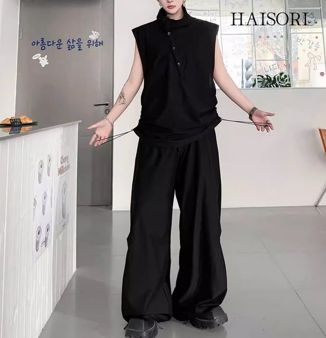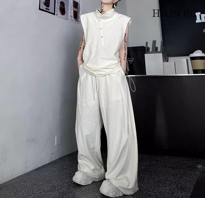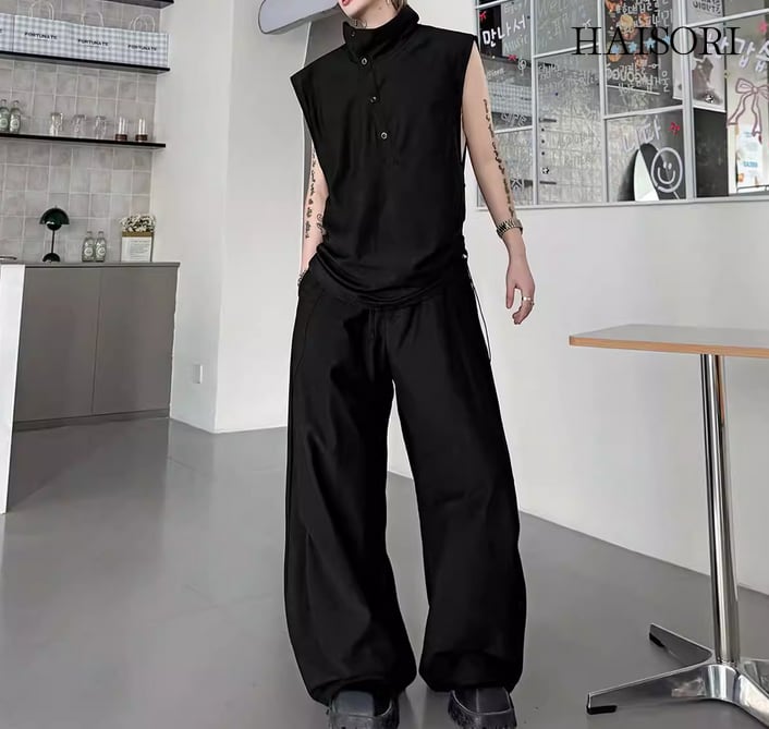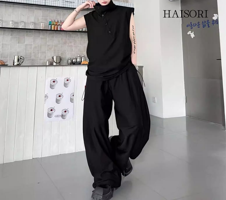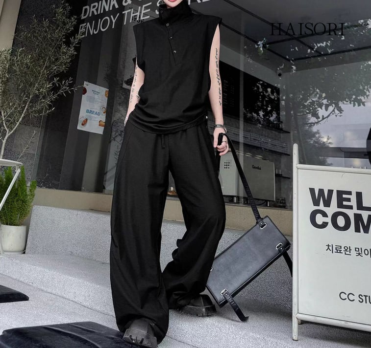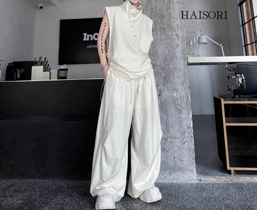 首元のボタンデザインが洗練されたアクセントを添え、ゆったりとしたワイドパンツがこなれたリラックス感を演出します。