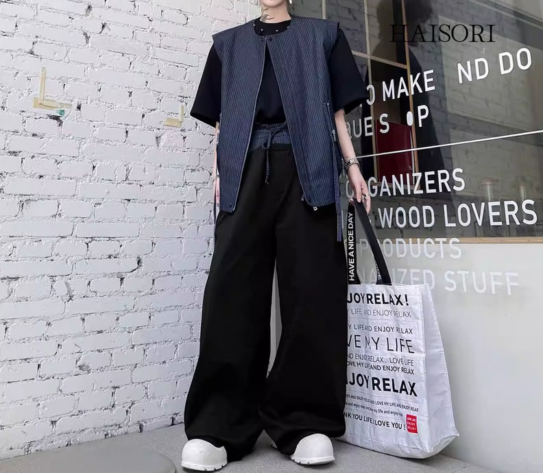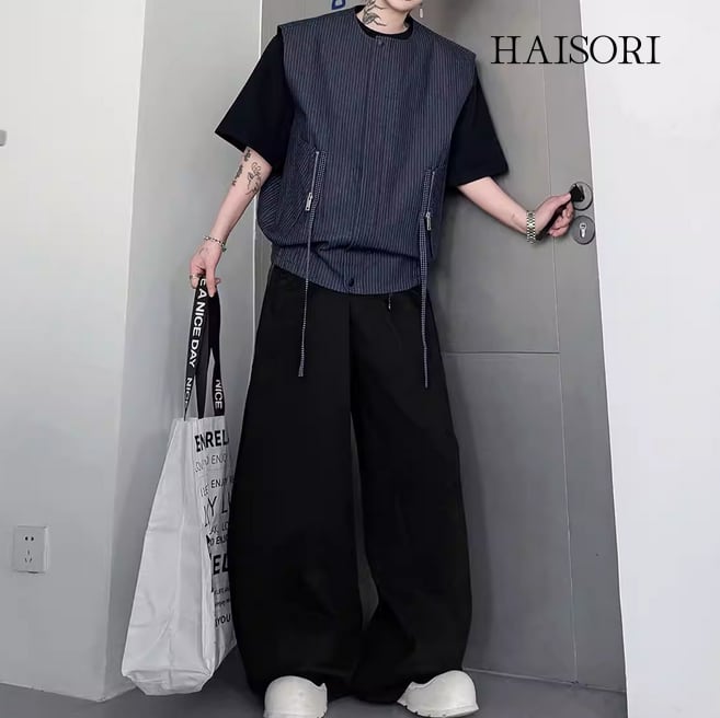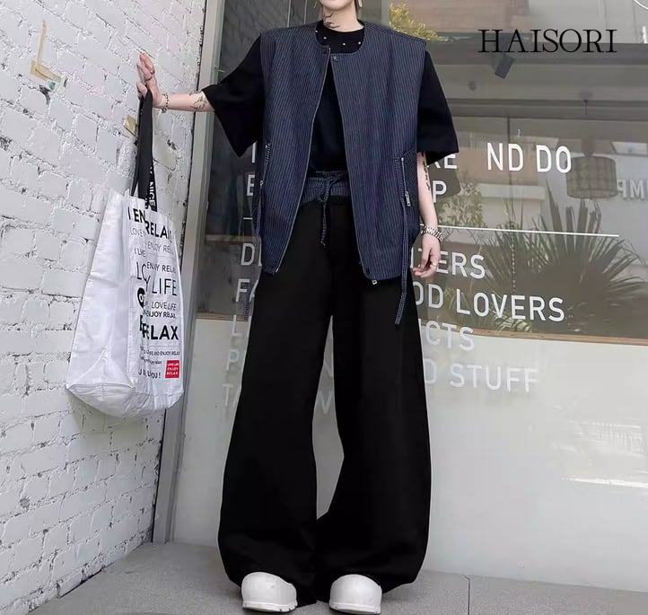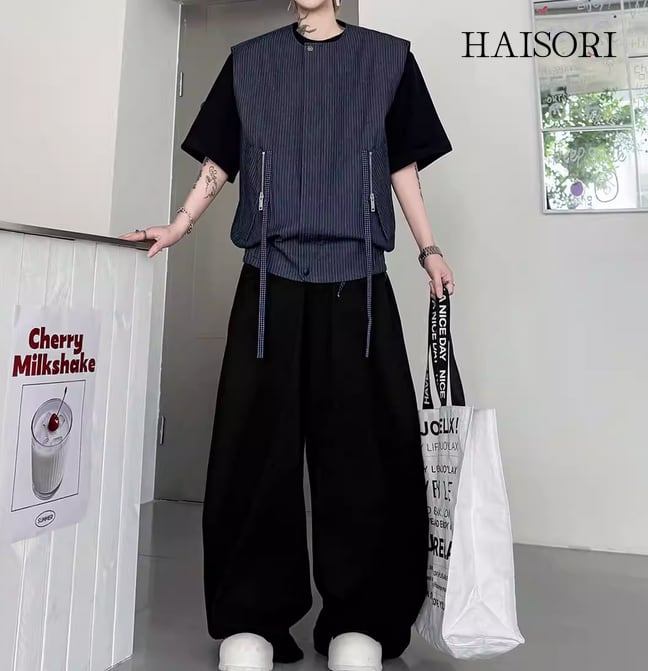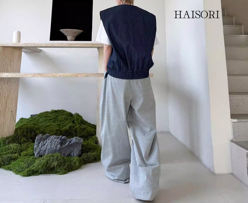 首元をスッキリ見せるVネックベストと、ゆったりとしたワイドパンツの組み合わせがこなれたモードスタイルを完成させます。