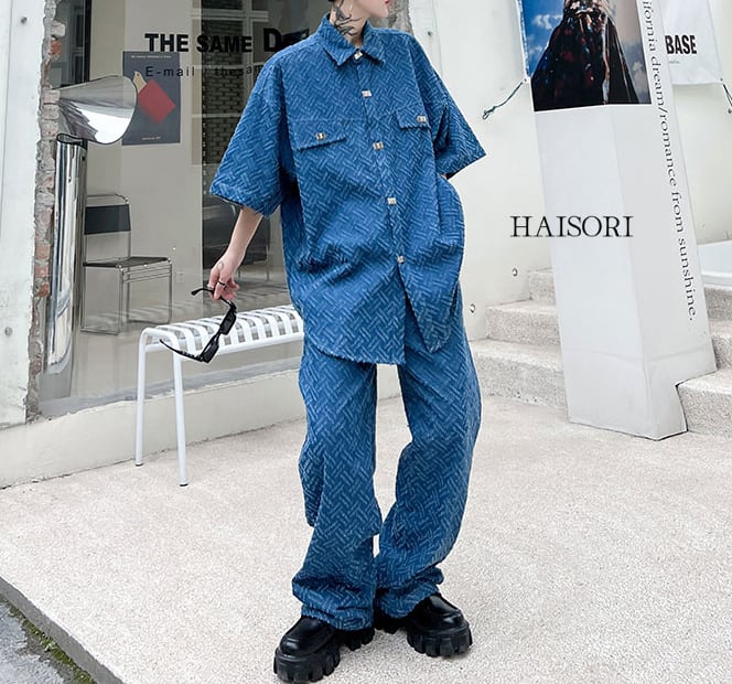★【 柄入りのデニム地を使用したシンプル過ぎないデザイン、カジュアルな装いのセットアップ 】