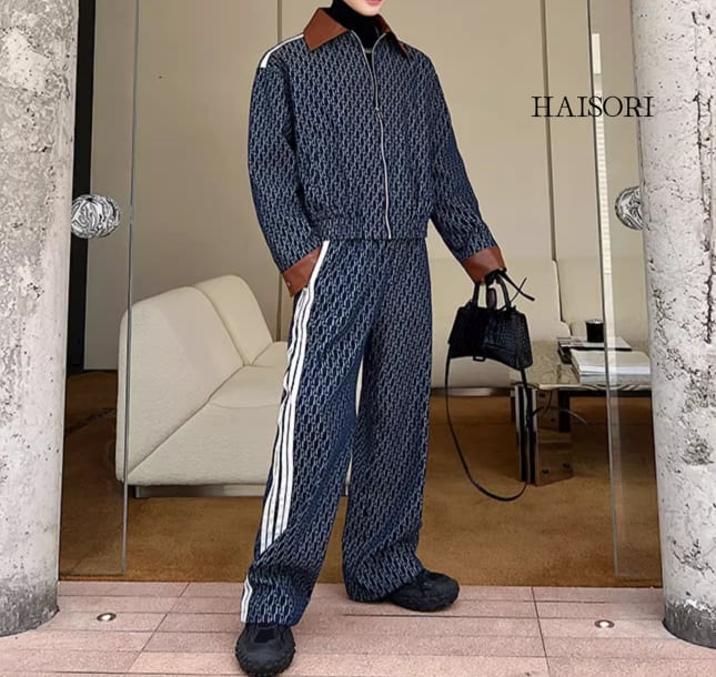 ★【 柄入り生地に襟や袖に異素材を合わせたメリハリ感のあるデザイン、オシャレ感も感じさせるジャージ風セットアップ 】