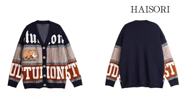 ★【 くまの柄とアルファベットが全体に配された明るいデザイン、可愛らしさも感じさせるカーディガン 】