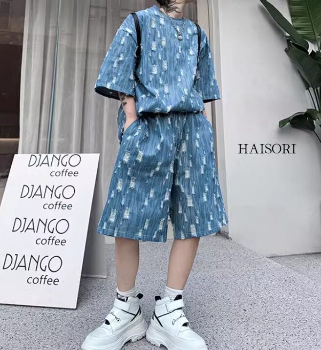 ★【 ダメージ加工をほどこしたデニム地デザインゆったりと着られるカジュアルスタイルのセットアップ 】