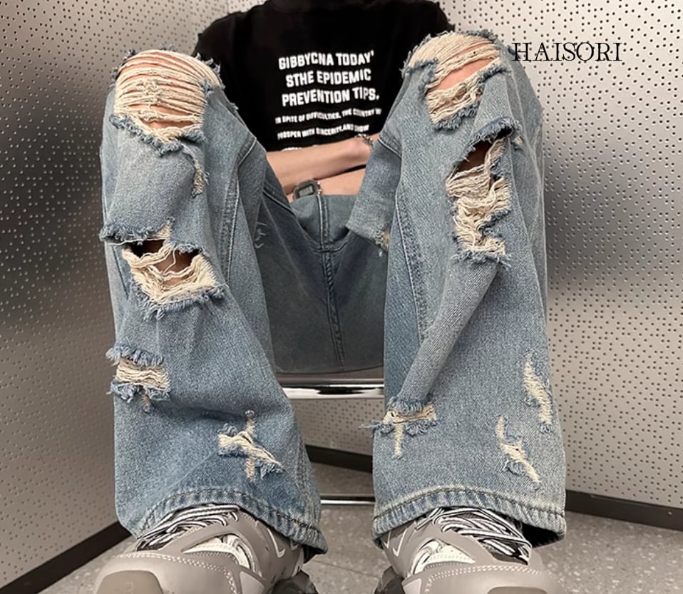 ★【 穴開きダメージ加工を施したわいルドなデザイン、ルーズシルエットのデニム 】