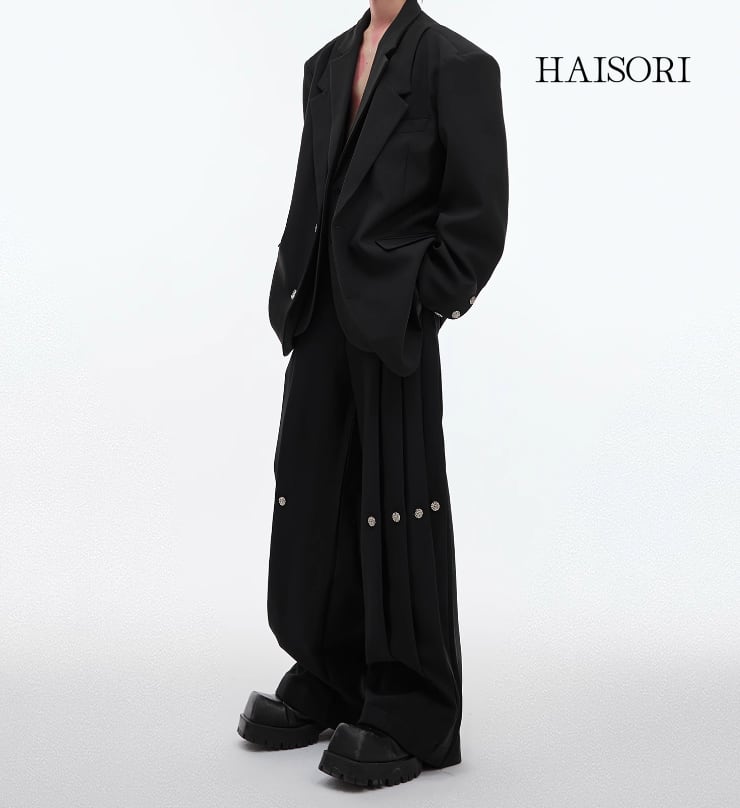 The jacket is a suit-like set-up with a cool texture and a huge, double-layered design.