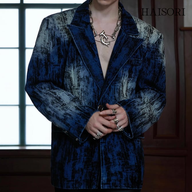 ★【 まだら模様入りのウォッシュ加工デニムを使用したワイルドなデザイン、落ち着いた色合いのカジュアルジャケット 】