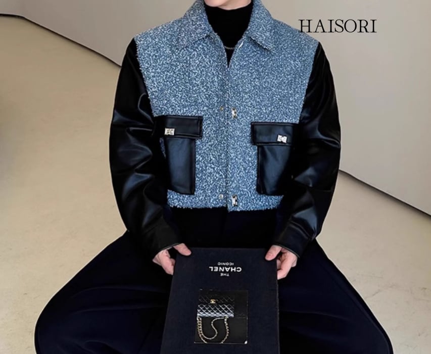 ★【 2種類の記事を使用した明るいデザイン、PU記事がアクセントになったおしゃれなジャケット 】