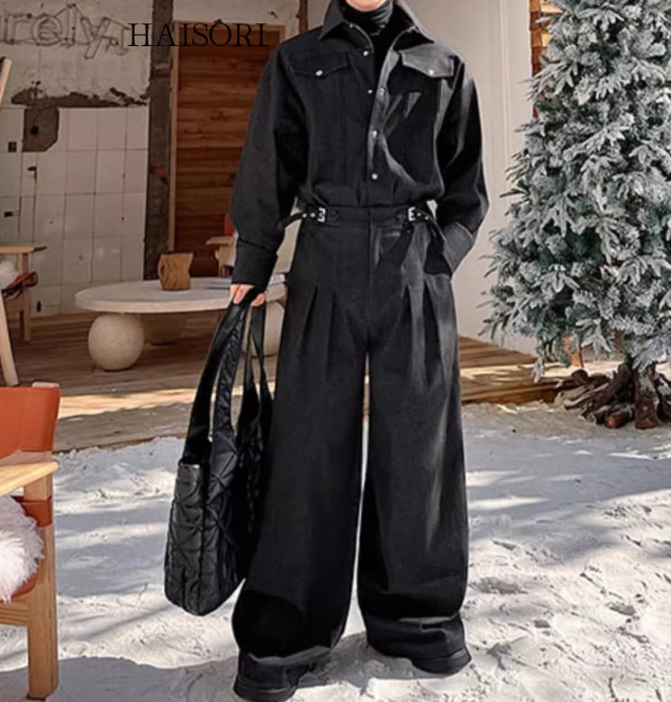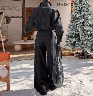 ★【 デニム地を使用したカジュアルなデザイン、ボタンがアクセントになったワイドシルエットのセットアップ 】