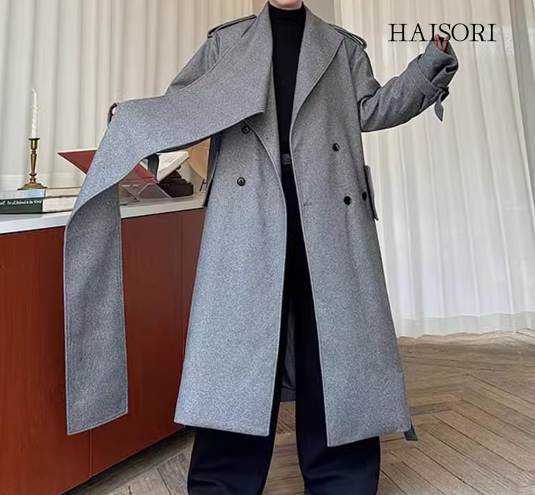 The long, retro-style, long-length coat with a unique design that can be wrapped like a scarf with a long collar.