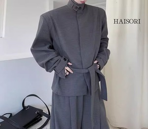 The set-up of a stand-up collar jacket with ribbon waistband and a chic design with a calm and relaxed atmosphere.